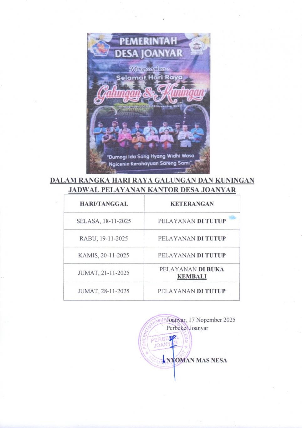 Dalam rangka menyambut Hari Raya Galungan, Pemerintah Desa Joanyar menyampaikan ucapan: