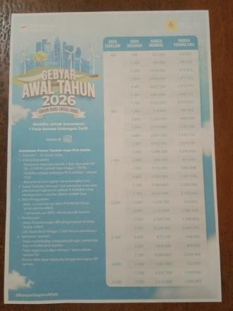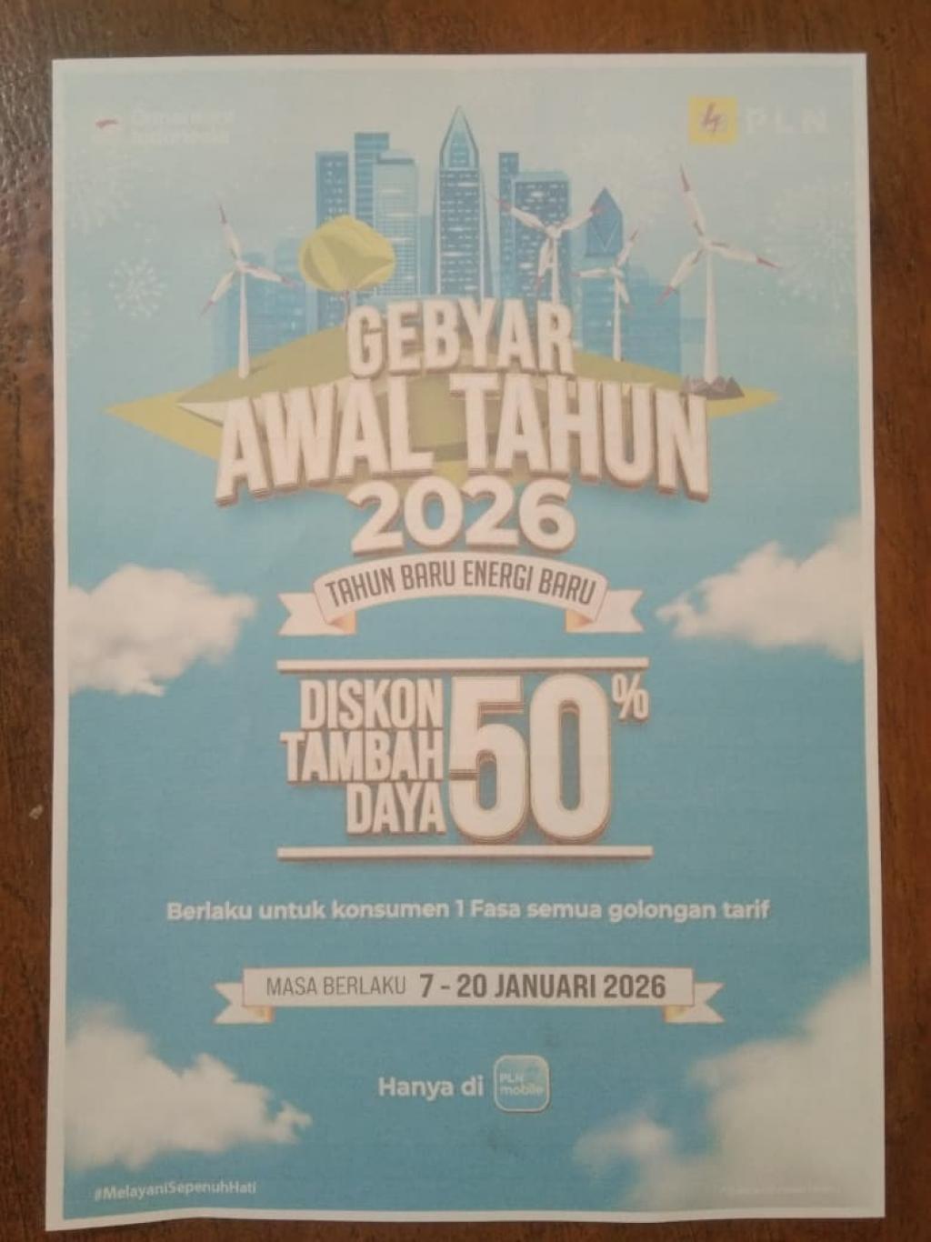 Gebyar awal tahun 2026 tahun baru energi baru, diskon tambah daya 50 % berlaku untuk konsumen 1 fase semua golongan tarif, masa berlaku 7-20 januari 2026