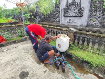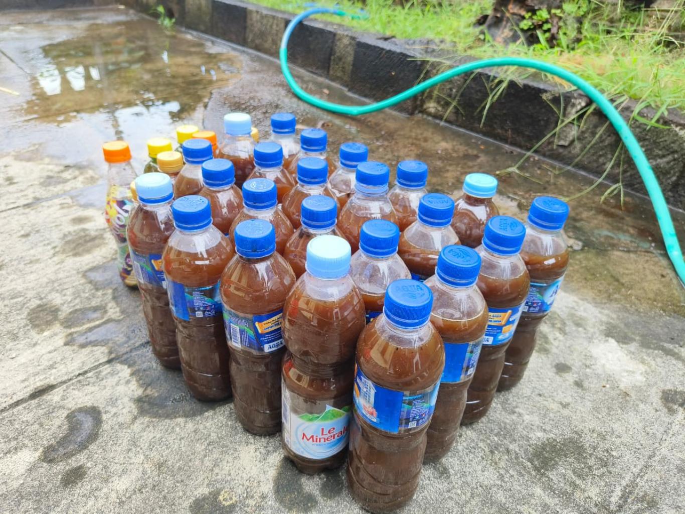 Kompos cair yang dipanen merupakan hasil fermentasi sampah organik seperti sisa sayuran dan daun kering yang diolah menggunakan komposter. Cairan hasil pengolahan ini selanjutnya dimanfaatkan sebagai pupuk organik cair untuk tanaman sayur, tanaman hias, serta kebun percontohan milik desa.